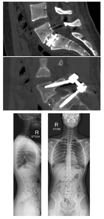 Операцию проводили руководитель Клиники патологии позвоночника и редких заболеваний, к.м.н. Алексей Евсюков и врач-вертебролог отделения №9, к.м.н. Полина Очирова. Вмешательство выполнили в два этап. Первым выполнили передний спондилодез, установили кейдж. Вторым этапом выполнили транскутанный спондилосинтез с последующей фиксацией.