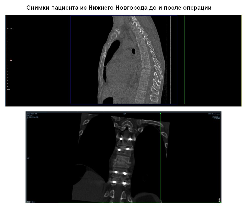 Алгоритм диагностики и лечения таких пациентов отработан за последние несколько лет: выявление инфекции, запускающей гнойный процесс, санация и этапная хирургия. Транспедикулярная система, как и в первом случае, дала возможность ранней вертикализации и профилактики послеоперационных осложнений.
