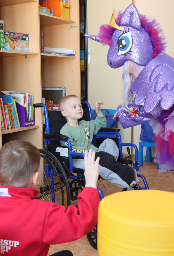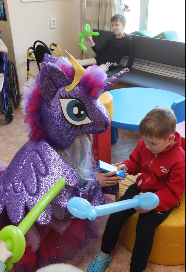 Поздравить февральских именинников прибыл сказочный единорог, который уверен, что хорошее настроение и положительные эмоции помогут ребятам быстрее выздороветь.
