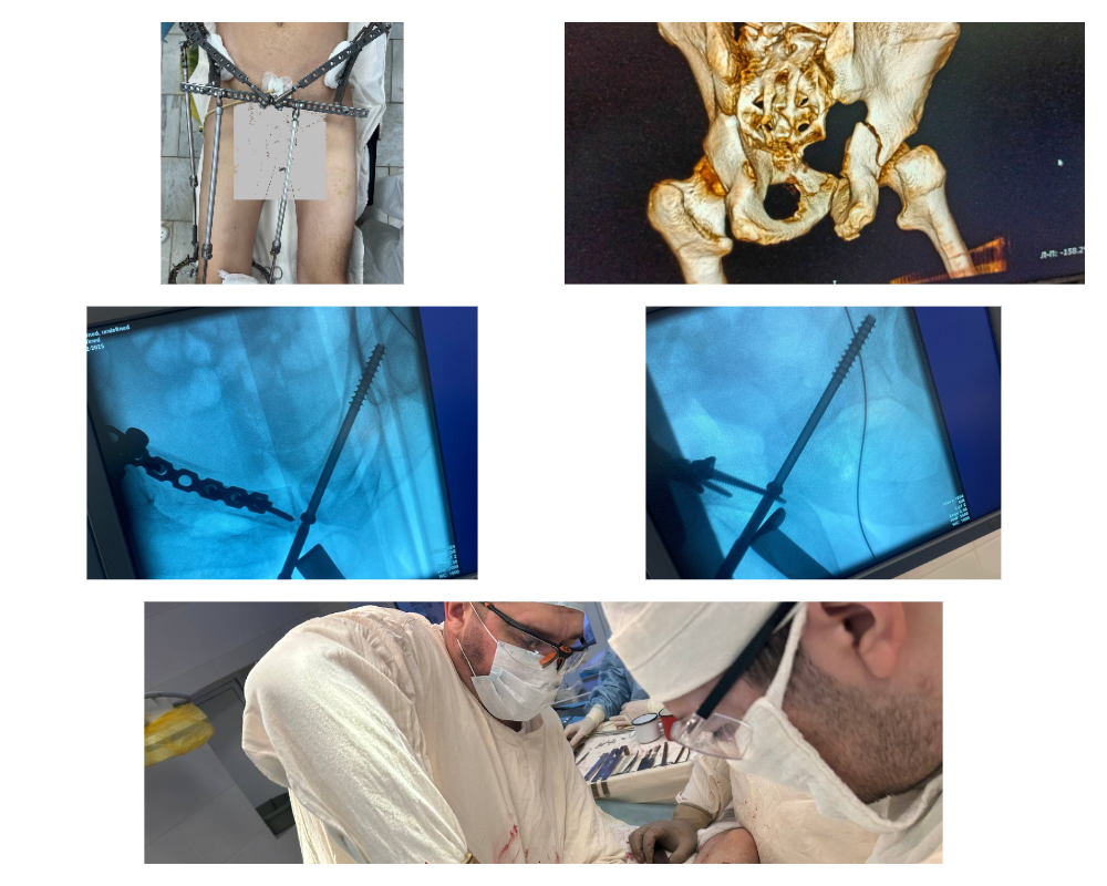 В ходе операции был демонтирован аппарат внешней фиксации и выполнен внутренний остеосинтез костей таза. Для активизации пациента данный метод считается самым эффективным. Во время этой же хирургической сессии было найдено место разрыва мочевого пузыря, который успешно ушили хирурги БСМП.