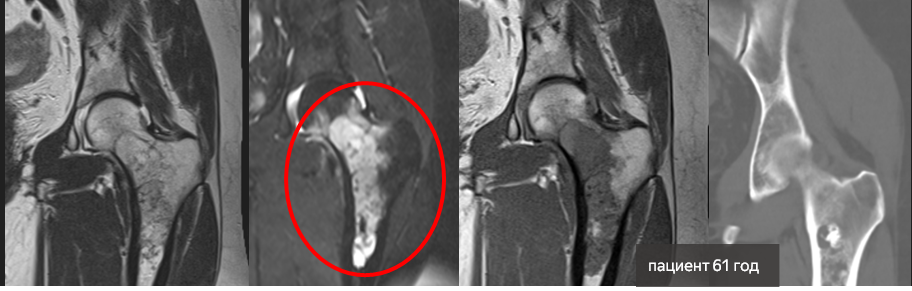Второй редкий случай у пациентки 61 года. С жалобами на боли в тазобедренном суставе женщина обратилась к травматологу-ортопеду. Дополнительным обследованием была выполнена компьютерная томография.