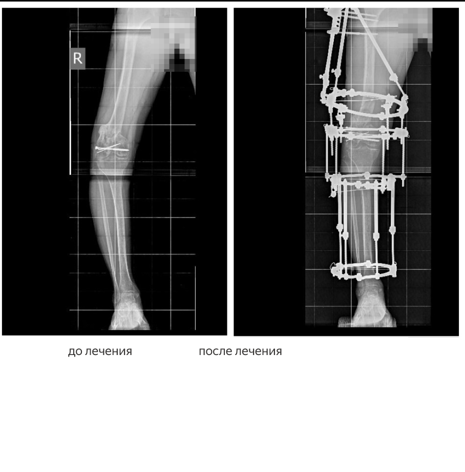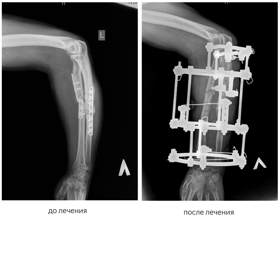 Оба случая — пример успешного применения метода чрескостного остеосинтеза по Илизарову, позволяющего исправлять даже самые сложные посттравматические деформации, которые не удалось вылечить традиционными способами.