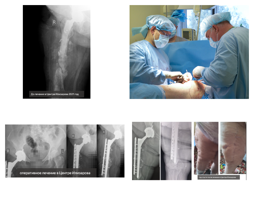 Дома у пациентки отмечалась рефрактура (повторный перелом) бедренной кости, в связи с чем она была вновь госпитализирована в НМИЦ ТО им. акад. Г.А. Илизарова. Врачи провели рискованную операцию для пациентки с тяжелейшим остеопорозом и дефектом-псевдоартрозом бедренной кости, распространенным полимикробным инфекционным процессом с наличием резистентных микроорганизмов.