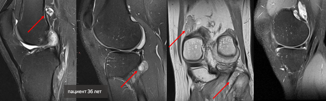 Молодой пациент обратился с жалобами на боли в коленном суставе и нарушение функции. Магнитно-резонансная томография показала наличие в коленном суставе множественных образований.