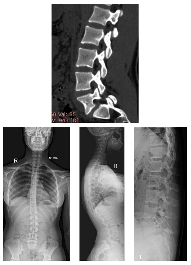 Девочка с детства занималась гимнастикой, но в последнее время ее стали беспокоить сильные боли в поясничном отделе и тянущие боли в икроножных мышцах. Дополнительные обследования уже в Клинике патологии позвоночника и редких заболеваний Центра Илизарова показали, что на фоне основного заболевания, дефицита щелочной фосфатазы сформировались характерные остеопатии, а также двусторонний спондилолиз.