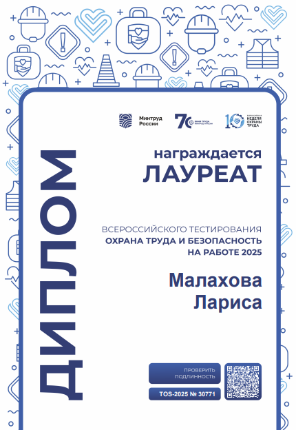 В тестировании приняла участие руководитель отдела охраны труда Лариса Малахова. Она продемонстрировала высокий уровень профессионализма, набрав максимальное количество баллов, став лауреатом Всероссийского тестирования «Охрана труда и безопасность на работе — 2025».